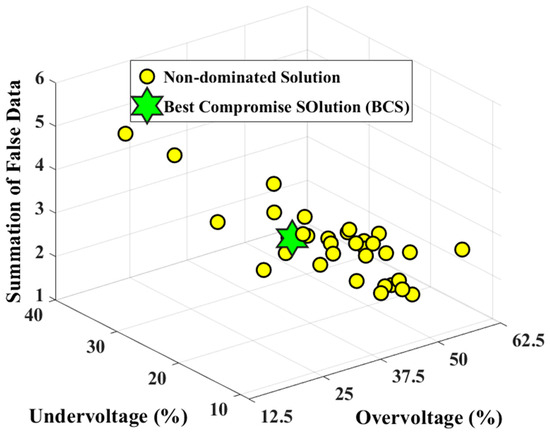 To cause voltage violation (i.e., both overvoltage and undervoltage at the same time), attackers optimize objective functions (10), (15), and (16) concurrently. Although the related 3D Pareto-optimal front is demonstrated in Figure 14, where the BCS among the three indicated objectives is obtained by applying (20) and setting ξk to 1/3 for all three functions (see the green hexagram), attackers have access to the set of 34 optimal solutions (see the yellow circles displayed in Figure 14). Thus, they can control the rate of voltage violation in the microgrid by opting for different solutions among the non-dominated solutions (i.e., yellow circles). As an illustration, if the intention is to increase the rate of overvoltage compared to undervoltage, the attackers can set ξ1 (i.e., the weight factor associated with overvoltage objective function) to 0.6, ξ2 (i.e., the weight factor corresponding to undervoltage objective function) to 0.1, and ξ3 (i.e., the weight factor related to false data vector) to 0.3 to ensure that the microgrid experiences a higher rate of overvoltage compared to undervoltage by keeping the attack stealthy. It is noted that any other combinations are valid since the repository includes 34 optimal solutions (i.e., yellow circles displayed in Figure 14).