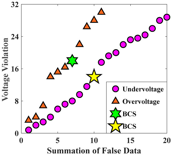 According to Figure 16, it can be gathered that the Pareto-fronts, which are well distributed, provide a range of overvoltage and undervoltage from 1% to more than 31%. In addition, the BCSs (i.e., green hexagram and yellow pentagram) are obtained while ξk for both objective functions (i.e., summation of false data plus either overvoltage or undervoltage) is equal to 0.5. Hence, the attackers can change the severity of voltage violations by setting the weight factors to other values.