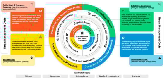 The Threat Management Cycle within the figure highlights the four critical steps for smart, resilient cities that organizations follow in the event of a cyber-attack: using analytics to predict threats (Sense) and strengthen the vulnerable aspects in urban systems and infrastructure (Defend), cities can prevent and tackle possible crises. The (Respond) step establishes systems for crisis management, while (Recover) identifies and sustains the organizational assets during a crisis and afterwards to ensure a continuous provision of essential services [49,50].