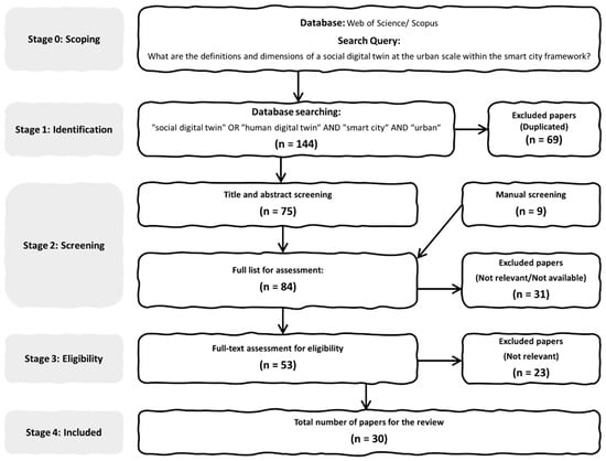 Next, the titles and abstracts of these 84 papers were screened to determine their relevance to the research question. The focus was on studies that explicitly addressed the integration of social dimensions into DTs within smart cities. As a result, 31 papers were excluded, either because they were irrelevant or due to the unavailability of full-text access. This left 53 papers for a detailed evaluation. These remaining papers then underwent a full-text assessment, where they were examined for their relevance, methodology, and contribution to the understanding of the social digital twin concept. During this phase, 23 papers were eliminated because they did not meet the criteria for relevance or depth concerning social aspects of DT technologies. Finally, 30 papers were deemed eligible for inclusion in the detailed review. A summary of the systematic review process is illustrated in Figure 2.
