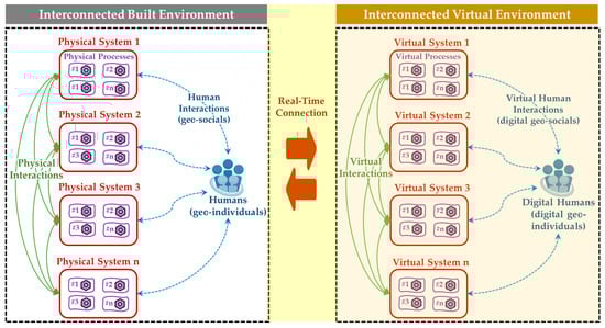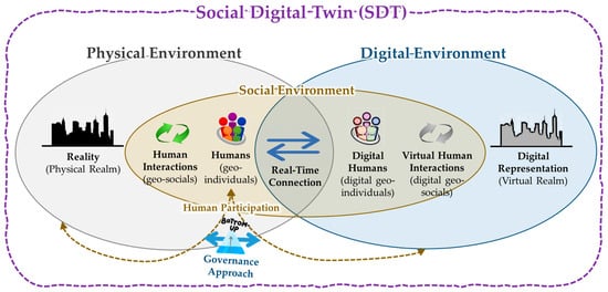 Based on the reviewed literature, the SDT can be defined as a system designed to replicate and represent social aspects through various stages. From conceptualization to application, the SDT functions as a dynamic virtual representation of an urban environment, seamlessly integrating physical and social elements via bidirectional, real-time connectivity. Central to this model is its ability to reflect the interplay between physical systems and humans (referred to as geo-individuals), as well as societal interactions at a macro level (geo-socials), as illustrated in Figure 5.
