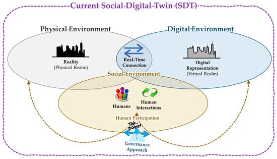 The SDTs mark a significant shift from the dominating top-down approaches, where citizen engagement typically occurs after the design phase. Instead, SDTs integrate community feedback directly into the entire process of system development [,,]. Thus, SDTs enable more transparent, participatory governance, allowing citizens to interact with and influence urban planning while addressing critical issues such as privacy, transparency, and accountability. This participatory model strengthens the relationship between system development and the needs of its residents, making cities more responsive and equitable. It also improves the accuracy and quality of social component modeling in the SDT model, ensuring a more authentic representation of the “place” [,,,,].