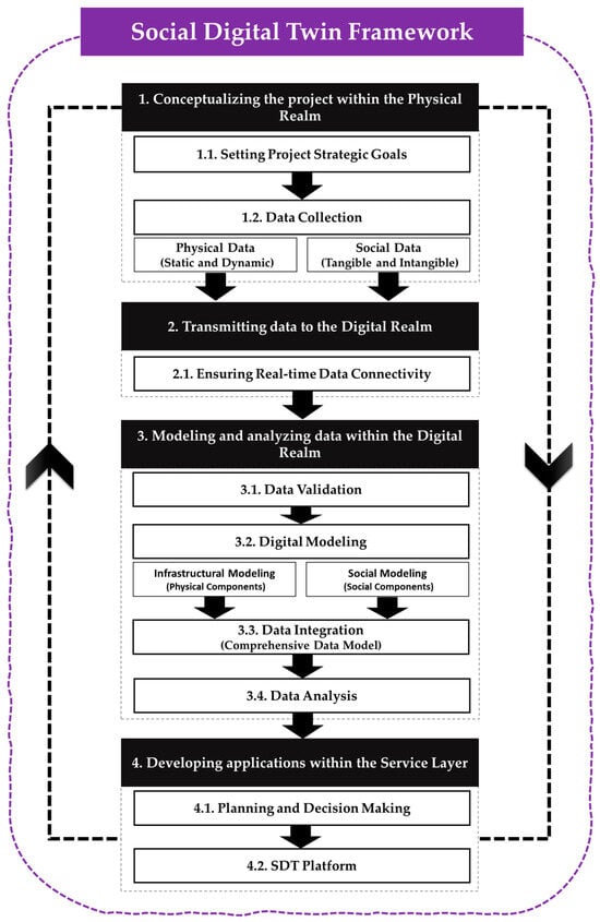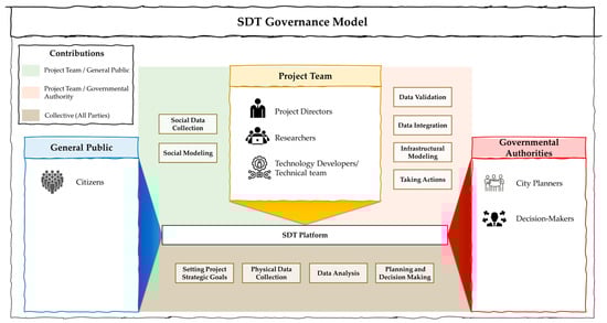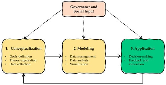 Additionally, effective governance structures play a key role across all these phases, along with social inputs that are equally vital, forming the foundation of the SDT’s representation of urban systems and enabling a cohesive integration of social dynamics into the overall SDT structure. This organizational structure is illustrated in Figure 6.