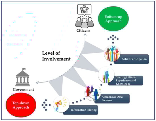 SDTs are designed to capture and digitally represent human knowledge and behavior of the “place” by adding subjective human experiences into UDT models. This inclusion enhances the representation of social dimensions, improving decision-making processes and supporting a range of urban applications []. Therefore, the governance approach adopted is essential for ensuring these models accurately incorporate human input and genuinely reflect the needs and interests of urban populations []. Citizen participation is increasingly recognized as a fundamental component in the governance of smart cities, enabling a more democratic and community-centric approach to urban development [].