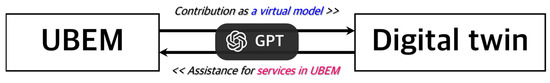 Figure 2 illustrates the structure of the GPT-based I-UDT, where UBEM and various technological components (UBEM tools and applications) required for data analysis are integrated with real buildings and a GPT. The I-UDT consists of four main elements: