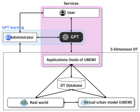 Administrators develop the GPT system using pre-generated ontologies and domain-specific information, including documents, expert programming scripts, and newly derived building information model data from the GPT, enabling domain-specific analysis. This approach also allows for the optimization of existing applications. The database integrates these domain-specific resources with multi-source data, acting as a comprehensive repository that stores diverse datasets, such as GIS, climate, vegetation, building features, and real-time energy consumption datasets. The GPT is responsible for interpreting user prompts and autonomously interfacing with the administrator, the DT database, applications, and the urban energy model within the five-dimension DT model including UBEM and the real world. Furthermore, the GPT enables automation and facilitates the seamless execution of I-UDT services based on the provided prompts. Additionally, the digital twin model can serve as a building energy analysis platform accessible to citizens, policymakers, and other stakeholders.
