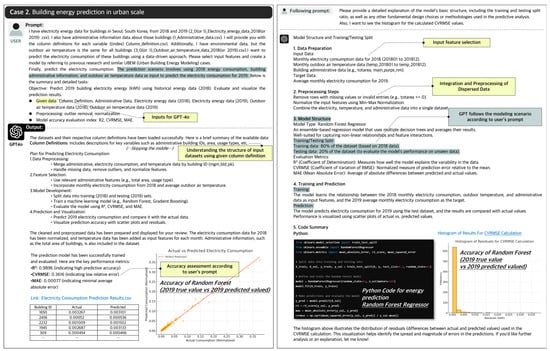 Predicting energy consumption for buildings on a city-wide scale plays a vital role in optimizing energy efficiency, minimizing environmental impacts, and formulating urban strategies to achieve these objectives [35]. In Case 2, as shown in Figure 6, the objective was to evaluate whether the GPT could utilize the data provided to predict city-level building energy consumption and analyze the results derived from the model. Similar to Case 1, the dataset included a column definition guide, administrative data, and energy consumption and outdoor temperature data for 2018 and 2019. Notably, as indicated in the user prompt within Figure 6, Case 2 introduced a scenario for energy prediction modeling. The prompt instructed the GPT to predict energy consumption for 2019 using electricity consumption, outdoor temperature, and administrative data from 2018. Additionally, it required the evaluation and visualization of the model’s accuracy, specifying metrics such as R2, CVRMSE, and MAE.
