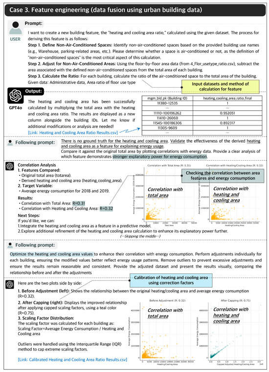 The GPT visualized the comparison using scatter plots and calculated the R-value for each variable. While the difference was slight, the heating and cooling area demonstrated a stronger correlation with energy consumption. Based on further prompts, the GPT then made adjustments to the heating and cooling area to enhance its relationship with electricity consumption. This was achieved by applying a correction factor, ensuring that the heating and cooling area better aligned with energy usage. Ultimately, the GPT generated the adjusted heating and cooling area data alongside the applied correction factors. This application can be integrated into urban building energy prediction modeling and has the potential to improve model accuracy. It represents a step towards optimizing features for more precise and reliable energy predictions in the future. However, certain limitations exist. The generated correction factor is derived from the relationship between the heating and cooling area and energy consumption, which inherently includes uncertainty and does not fully account for various environmental and regional conditions. Therefore, it is necessary to verify whether the corrected heating and cooling area closely aligns with the actual heating and cooling area of buildings. However, since there are no ground truth values for heating and cooling areas in South Korea’s urban data, the correction factor can be indirectly validated by using it as an input variable in energy prediction models or directly verified through field surveys and measurements.