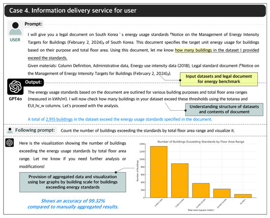 Figure 8 illustrates the application of user-centered information delivery services in Case 4. The user, through a simple prompt containing the phrase “how many buildings in the dataset I provided exceed the standards”, sought to identify the number of buildings in the dataset that exceeded the energy usage standards. The standards presented in this study are national legal standards applicable across South Korea, with energy weighting factors provided for 17 regions, including Daejeon (weight is 1.0), which is in the center of the country. We conducted a case study on buildings located in Seoul, where the energy weighting factor is 1.35. Accordingly, the GPT evaluated the EUI value by multiplying it by 1.35.