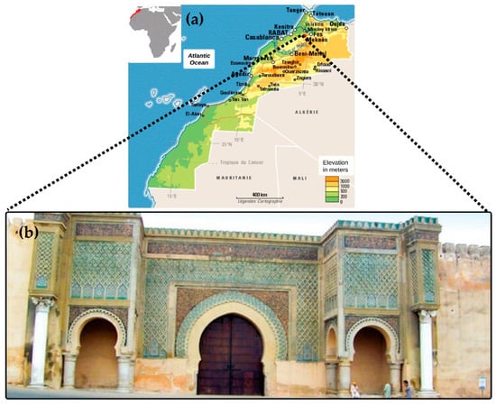 Bab al-Mansour, also known as Bab Mansour el-Aleuj (Figure 1), is one of Morocco’s most significant historical landmarks. Situated in Meknes city, the gate exemplifies the fusion of Moroccan and broader African design principles, serving as a distinguished symbol of the region’s architectural sophistication and cultural legacy [33,34,35,36].