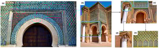 Architectural details of Bab Al-Mansour gate: (a) main arch, (b) lower arches, (c) decorative tilework, (d) column Capital, and (e) mosaic patterns.