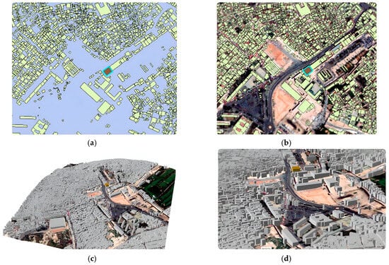 Accurate graphical and spatial data are essential for generating the Digital Twin of Bab Mansour. For large-scale surveying and mapping, Remote Sensing (RS) extends the observational range of ground-based methods, capturing high-resolution satellite and aerial images of the monument and its surrounding landscape [36]. These images can be integrated into GIS to create a comprehensive digital map of the site. Figure 3 presents various levels of detail (LoD) for the 3D representation of Bab Mansour and its surrounding urban context. In Figure 3a, LoD 0 depicts Bab Mansour in brown, offering a simple footprint of the buildings in the area. Figure 3b enhances this view with an RBV satellite image in the background, providing geographical context. Figure 3c,d transition to LoD1, utilizing SRTM data as a Digital Elevation Model (DEM) for a 2.5D visualization, which captures both horizontal and vertical details of the terrain and built environment. These progressive LoDs allow for a comprehensive understanding of Bab Mansour’s spatial positioning and elevation, which is essential for urban planning and heritage conservation efforts. To address the identified research gaps, this study emphasizes the unique benefits of applying the DT framework to Bab Mansour. Unlike previous studies that primarily focus on enhancing visitor engagement or addressing GIS-related urban planning challenges [37], this research demonstrates how DT technology advances the preservation of heritage structures through innovative surveying and mapping techniques. By integrating tools such as RS, GIS, and advanced visualization methods, this study captures the intricate architectural details of Bab Mansour while also offering a replicable framework for managing complex heritage sites. Moreover, parallels are drawn with established methodologies, such as those in Digital Twin as a Service (DTaaS) in Industry 4.0 [38], to highlight how the Bab Mansour Digital Twin contributes to broader heritage preservation techniques by providing actionable insights, real-time monitoring, and scalable solutions.