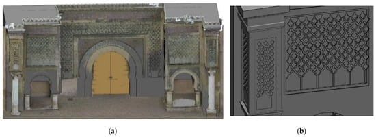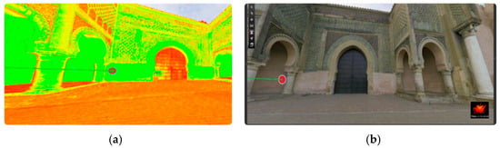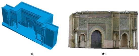 High-resolution laser scanning is conducted to capture precise geometric data of Bab Mansour (Figure 4a,b). This process generates a detailed point cloud that serves as the foundation for the DTHB platform. Point cloud processing is a crucial step in the creation of detailed 3D models for HBIM [46,47,48]. This process involves converting raw data captured through laser scanning into a structured format that can be used to generate accurate digital representations of heritage buildings [49,50,51]. The field of heritage building has inspired, over the last few years, a greater interest more and more on behalf of the scientific community that deals with surveying [2]. The idea that knowledge of a site does not apply only to its history but must necessarily include its characteristics of position, shape and geometry, is gathering pace [52]. Constructive techniques, make analysis of geometrical details easier, which is difficult to achieve with traditional techniques [20]. The biggest problems in the use of survey techniques are the graphic outputs for restorers and architects; in fact, they often do not know the real potential of these techniques, methodologies, and functionalities and they expect traditional outputs such as the floor plans, sections, and front elevation of a cultural asset [52]. In the following example, a case study focused on finding a workflow to support a study, restoration, and conservation project of cultural heritage, automatically (or with a limited manual operation) extracting graphic outputs from laser scanner surveys performed in the ancient Medina of Meknes.