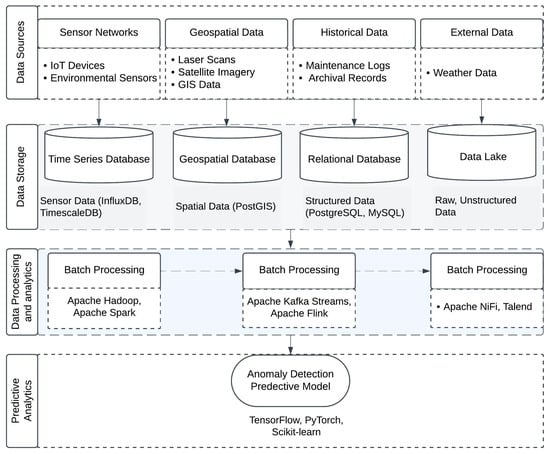 Predictive modeling and data analysis are integral components of the proposed DTHB framework, enabling proactive and data-driven decision-making for heritage conservation. Physics-informed models, such as Finite Element Analysis, are proposed to simulate the structural response of heritage buildings under varying environmental and stress conditions, identifying high-stress zones and potential vulnerabilities. Machine learning techniques, including random forest, neural networks, and support vector machines, are recommended to process historical and real-time data from sensors [21]. These models can predict structural degradation, assess environmental impacts, and classify risk levels to support targeted interventions [40,51]. Furthermore, linear regression models are suggested to analyze correlations between environmental factors, such as pollutant levels, and material degradation [66]. Table 2 provides a summary of the proposed predictive models, their purposes, applications, and expected outcomes, demonstrating how they contribute to the analytical capabilities of the DTHB framework.