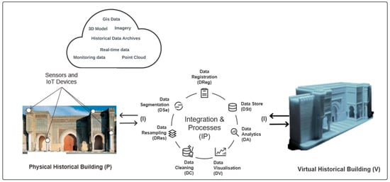 To ensure seamless integration between physical and virtual representations, Figure 6 outlines the transformation process from the physical historical building (P) to the virtual historical model (V) through various integration and processing steps. These include data cleaning, registration, segmentation, resampling, storage, and visualization, all supported by sensors, IoT devices, and point cloud data. This process facilitates dynamic interactions and provides a detailed and accessible digital replica of the heritage site.