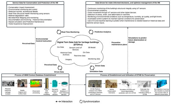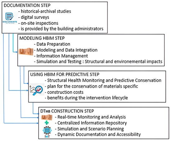 The DTHB framework represents a groundbreaking approach to the preservation and management of heritage buildings. By leveraging advanced Digital Twin technology, this framework creates a detailed virtual replica of a heritage structure, enabling real-time monitoring and analysis of environmental conditions, structural health, and occupancy [97]. The DTHB framework integrates sensors, cloud computing, and predictive analytics to provide a comprehensive and dynamic model that not only mirrors the physical state of the historical building but also simulates future scenarios [98]. This innovative approach allows for proactive preservation efforts, informed decision-making, and enhanced visualization through 3D models, AR, and VR applications. By ensuring continuous data flow and employing sophisticated analysis tools, the DTHB framework aims to safeguard the integrity and longevity of heritage buildings, ultimately contributing to the sustainable preservation of cultural heritage. The establishment of the DTHB involves several key steps, beginning with data integration and IoT implementation within the HBIM model to embed historical records, documents, and annotations, while linking oral histories and narratives to specific parts of the structure. Sensor deployment is essential, enabling the continuous monitoring of environmental conditions, such as temperature and humidity, along with structural health indicators, including stress levels and vibrations. These sensors ensure that real-time data feeds into the DTHB, allowing for ongoing monitoring and maintenance of the building’s condition. Additionally, extracting geometric primitives is crucial for creating an accurate and robust architectural model, which serves as a solid foundation for the preservation, management, and analysis of heritage buildings, ensuring the maintenance of their historical and structural integrity [99].