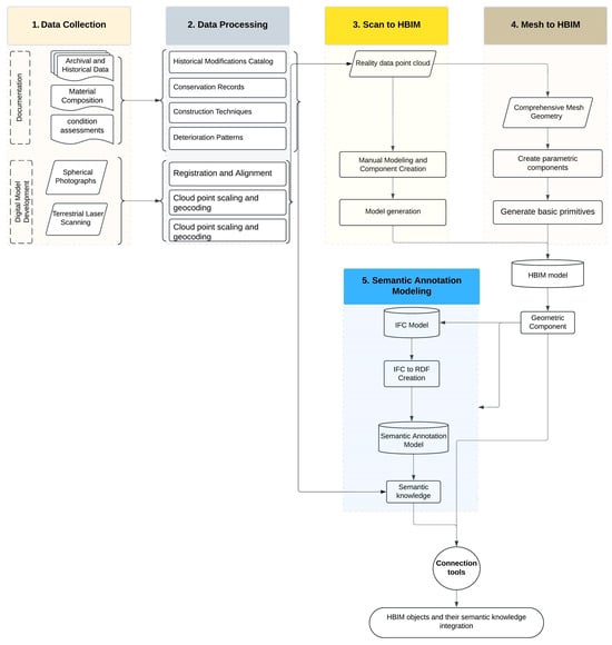 The development of the HBIM database is a meticulous process that transforms raw survey data into a structured and semantically enriched model, capable of supporting advanced conservation and restoration activities [69,70,71,72]. The workflow for constructing such models begins with data collection, incorporating archival documents, material composition analyses, and condition assessments, alongside high-resolution spherical photographs and terrestrial laser scanning data (Figure 8). These inputs enable a robust understanding of a heritage structure’s materials, historical transformations, and current conditions [73,74,75,76].