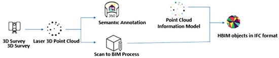 Following data collection, the data processing phase aligns and scales cloud point data, supported by the analysis of historical modifications and construction techniques. This ensures the preparation of cohesive datasets that form the foundation for precise 3D modeling. The scan-to-HBIM and mesh-to-HBIM stages further refine these datasets, converting raw reality point clouds into detailed parametric components and comprehensive geometric models [77,78,79,80]. These workflows are critical for capturing intricate architectural elements like arches, columns, and decorative patterns, as illustrated in Figure 9, which outlines the overall modeling process from laser point cloud acquisition to the creation of enriched HBIM objects in IFC format.