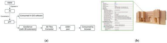 (a) Web integration of HBIM using CityGML and (b) detailed geometry and property analysis via Feature Manipulation Engine inspector.