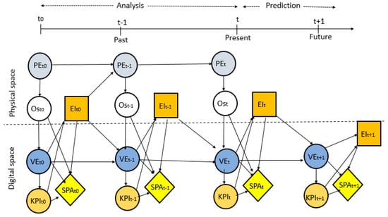 This equation describes the joint probability distribution of all variables at time t, capturing the interactions among the physical state, sensor observations, Digital Twin updates via bidirectional communication, and external interventions.
