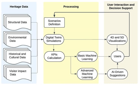 All collected information is centralized in an Information Repository, providing a cohesive digital platform where historical records, structural health data, and maintenance logs are stored and easily accessed [95,96]. This repository, enriched with KPI metrics, serves as the backbone for simulation and scenario planning, enabling heritage managers to create and test various intervention strategies and conservation techniques under different environmental conditions [97]. The system also includes dynamic documentation and accessibility, to update, review, and share information in real time, ensuring that all conservation efforts are based on the most current and accurate data [97]. Through this integrated approach, the DTHB construction step, with the incorporation of KPI calculations, lays the foundation for a robust and sustainable preservation strategy. It supports effective decision-making and long-term conservation planning by providing a quantitative basis for evaluating the impact of different preservation strategies and ensuring the optimal allocation of resources based on measurable outcomes.