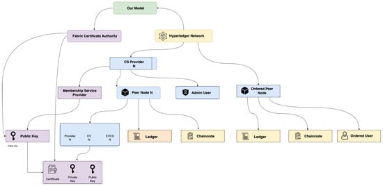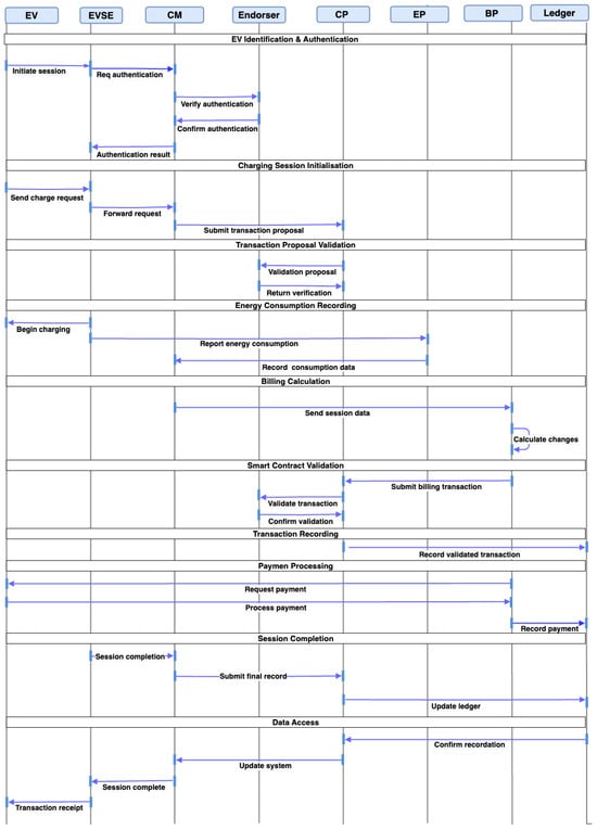 Figure 2 presents an overview of the essential components within the blockchain-based EV charging network, highlighting the roles of entities such as the Fabric Certificate Authority, Hyperledger Network, Membership Service Provider, peer nodes, and admin users. Each entity’s interaction with private and public key mechanisms, chaincode execution, and ledger maintenance establishes a secure and verifiable framework for managing EV charging transactions.