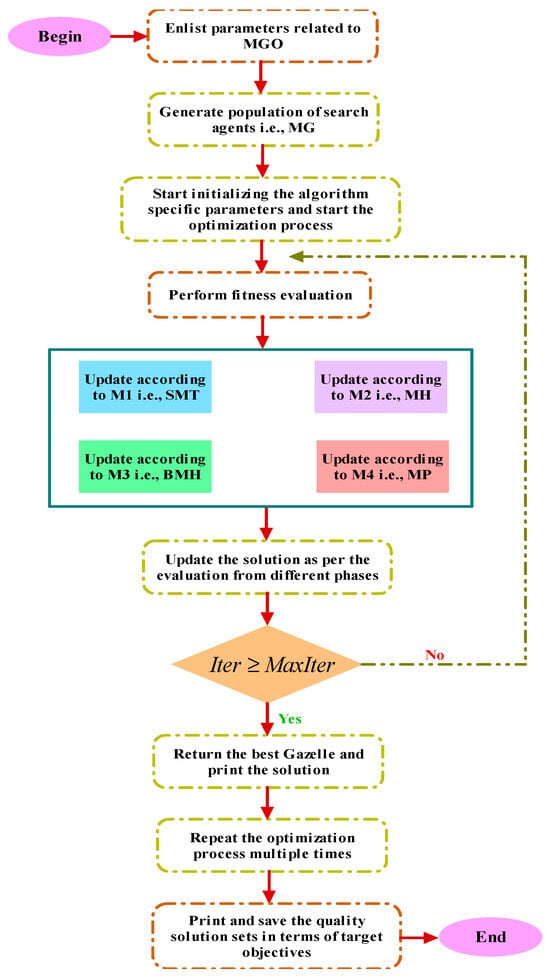 All the four mechanisms discussed apply to all MGs to sort new generations and update accordingly. Each generation produced in this fashion is equivalent to one replication. Finally, the best ones with capable solutions are sorted among the population, and the frail ones are eliminated. The optimization process flowchart followed to reach the desired solution is presented in