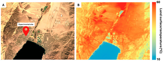 (A) A map of the general region of Eilat on the shores of the Red Sea (Landsat). (B) A land surface temperature map of the region of Eilat during the time of measurements (Landsat).
