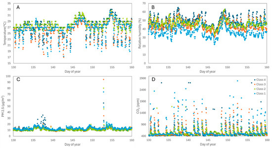 Observations of temperature (A), relative humidity (B), PM2.5 (C), and CO2 (D) during 130 and 160 day of year (DOY) 2023. The observations are class-specific (four classes in total).