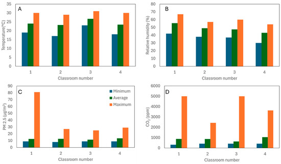 Unlike temperature, relative humidity, and PM2.5, which depend greatly on outdoor conditions, CO2 concentrations mainly depend on the number of students occupying the classroom and the ventilation system. The CO2 concentrations (Figure 3D) support this, showing higher values when the classrooms are occupied (8:00–14:00). Given that the school lacks a central ventilation system, the main reason for high CO2 concentrations is the number of students. This is clearly shown in Figure 4D, where Class 3, which has a much lower student number per area (Table 1), produced lower CO2 levels. All classrooms experienced higher than recommended CO2 levels (Table 3), coinciding with the lack of a central ventilation system and the tendency to shut doors and windows due to high heat and PM concentrations.
