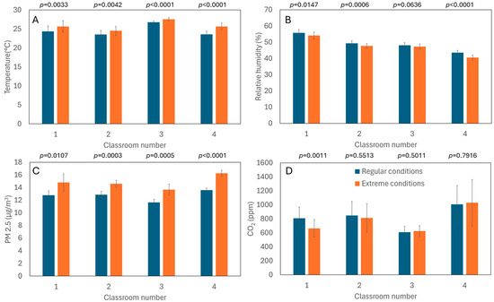 Daily (8:00–14:00) average values of temperature (A), relative humidity (B), PM2.5 (C), and CO2 (D) under regular conditions and under extreme conditions. The bars represent standard deviation, and above each two bars is the p-value for the test of significant difference (95% confidence level).