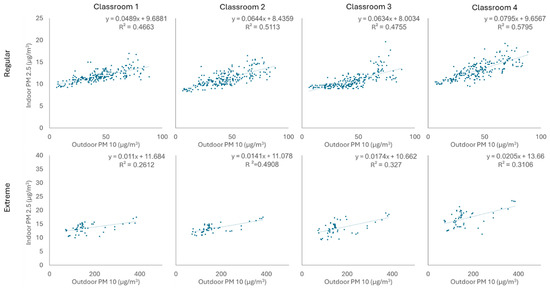 The correlation between indoor PM2.5 and outdoor PM10 measurements is presented in Figure 7. This figure illustrates the differences in correlation between regular and extreme conditions across various classrooms. When examining these correlations, we observe that the slopes of the linear regressions are steeper under regular conditions. Although maximum outdoor PM10 concentrations during extreme conditions were approximately five times higher than those under regular conditions, indoor PM2.5 concentrations during extreme conditions were only slightly higher than those during regular conditions.