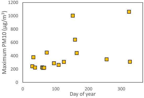 Maximum PM10 half-hourly concentrations during a sandstorm event. The data were taken from a monitoring station operated by the Israeli Ministry of Environmental Protection. A separate sandstorm event was defined when there was at least a 12 h difference with no sandstorms before and after the event.