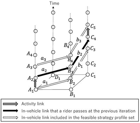 Driver and rider trips must of course match spatiotemporally. We use a space–time extended network (STEN) to model all activities; a two-dimensional network is extended to three dimensions by adding a time dimension. STEN nodes are defined for each time step and expressed as , where i is the node identifier in the two-dimensional network and t is the time step at this node. We define three types of nodes and links—an in-vehicle link, an activity link, and a waiting link—and allocate different utilities to the time spent on activities and the time spent in-vehicle. See Shimamoto [6] for further details on the STEN model.
