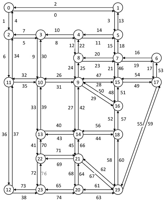 This appendix illustrates the matching method between drivers and riders narrowed down by the algorithm shown in Section 4.3. As a result of the algorithm, suppose the drivers and riders to move in the STEN are assigned as shown in Figure A1. For example, three drivers, , , and , travel between nodes 1 and 2. Due to the fifth assumption described in Section 3.1, riders are matched in order from the highest ranked driver. Therefore, and , and and are matched between nodes 1 and 2, but does match any rider between nodes 1 and 2. If the rating of two or more drivers (riders) is the same, drivers (riders) are randomly selected in order until 1) all of those in the same rating are matched, or 2) there is no matching partner.