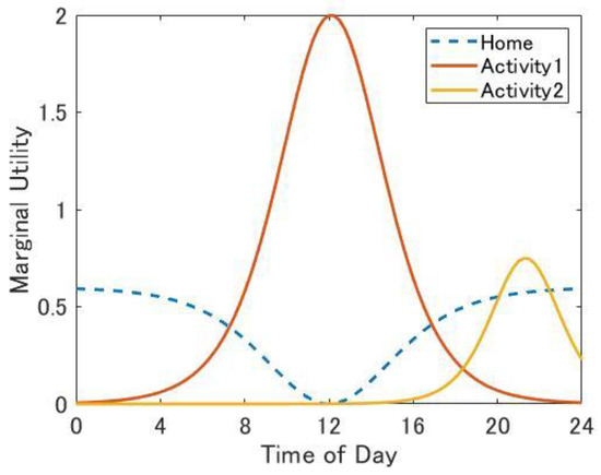 where is the baseline utility of activity , is the maximum utility of activity , and , , and are activity-specific parameters. The parameter determines the time of day at which the marginal utility reaches its maximum value (i.e., the inflection point), determines the relative position of the inflection point, and determines the slope or steepness of the curve (Li et al. [7]).