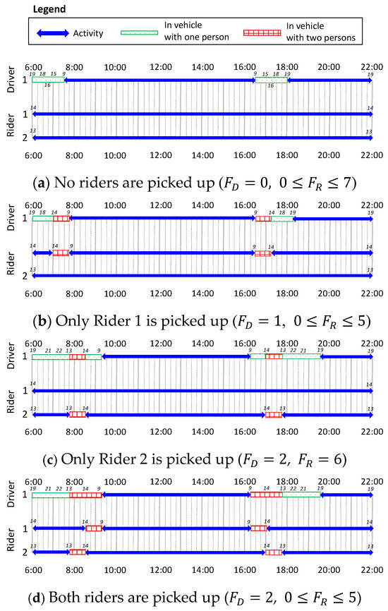 As we apply the proposed model while varying the unit of the fee, from 0 to 2 and from 0 to 7, we obtain four types of assigned activity patterns, as shown in Figure 4: (a) no riders are picked up, (b) only Rider 1 is picked up, (c) only Rider 2 is picked up, and (d) both riders are picked up. The conditions affecting the units of the fees, and , for each solution are also shown. Note that the solution (d) is identical to the solution that maximises the total utility. Compared to Figure 4a,b, Driver 1’s travel time increases by due to picking up Rider 2. This increase in travel time reduces the utility for Driver 1 by 9.06, and the breakdown of this calculation is shown in Table 3. Therefore, Driver 1 is not motivated to pick up Rider 2 when . On the other hand, when , Driver 1 can earn a fee equivalent to if he or she picks up Rider 2, which provides a motive for Driver 1 to pick up Rider 2. Similarly, compared to Figure 4a,c, Driver 1’s travel time increases by when picking up Rider 2, which reduces the utility for Driver 1 by 89.01, as shown in Table 3. However, when , Driver 1 can recover their loss of utility by earning a fee equivalent to . Note that Driver 1’s strategy illustrated in Figure 4c is identical to that in Figure 4d. However, Rider 1 is not picked up by the driver because the utility of being picked up is less than the utility of staying home due to the high unit of fee for riders. Thus, the strategy illustrated in Figure 4d is obviously in equilibrium for Driver 1 because he/she can earn more by picking up Rider 1.