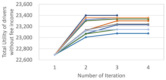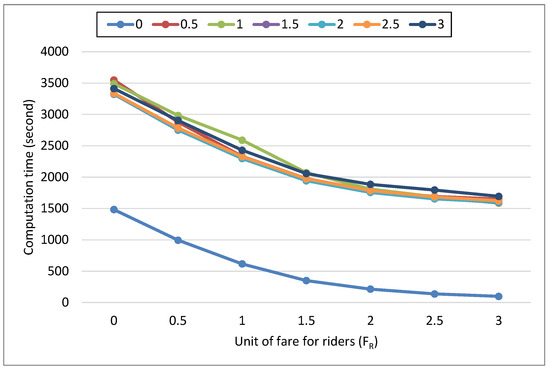 To investigate the convergence process, Figure 5 illustrates the relationship between the number of iterations and the total utility of drivers without fee income. Note that it takes three iterations to reach convergence when and four iterations when . The total utility continues to increase as the number of iterations increases up to two or three, then the calculation terminates when the total utility becomes constant. We confirmed that a convergence solution is obtained according to the process described in Section 4.4. Figure 6 shows the computation time for each combination of unit of fee when run on a computer with an Intel Xeon CPU E5-1650 @3.6 GHz with a 64 GB RAM. The horizontal axis in the line graph represents the value of while the legend represents . The computation time when is significantly shorter than the computation time when is greater than 0. This is because the drivers’ strategy is not affected by the riders’ strategy when ; hence, it converges faster than when is greater than 0. Furthermore, the computation time decreases as increases due to the reduction in the feasible solution set defined in Equation (7a).