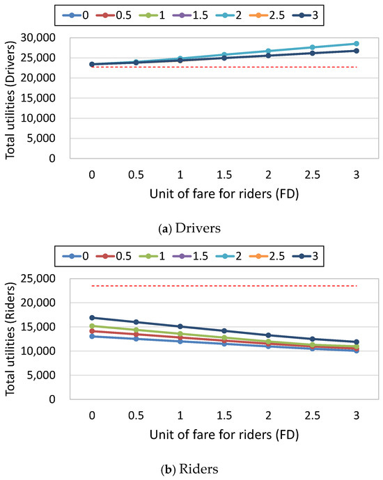 Figure 7a,b illustrate the total utility for drivers and riders, respectively. As the unit of fee earned by drivers, , increases, the total utility of drivers tends to increase regardless of the value of the unit of fee paid by riders, . On the other hand, the total utility of riders tends to decrease as the unit of fee paid by riders, , increases. In contrast to the total utility of drivers, the smaller the value of for the same value of , the smaller the total utility of riders. This is due to the asymmetry between drivers’ and riders’ strategies, i.e., while drivers can move freely, riders have to travel in drivers’ vehicles. Furthermore, compared to the total utility calculated from our previous model, the total utility of drivers in all cases is greater, while that of riders is lower in all cases.