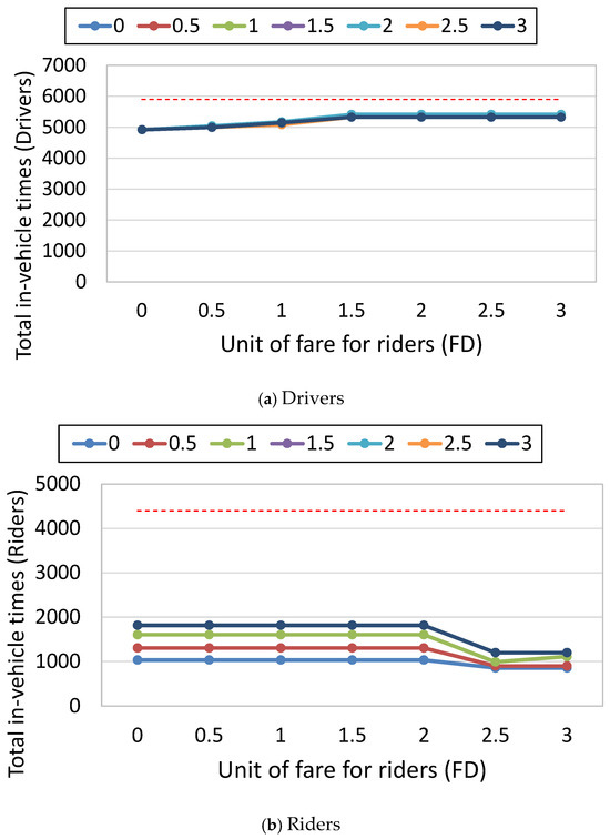 Figure 8a,b illustrates the total in-vehicle times of drivers and riders, respectively. The total in-vehicle times of drivers are not affected by the value of , and they increase as the value of increases up to 2.0 because the drivers try to pick up more riders. Furthermore, the total in-vehicle times of drivers in all cases are smaller than that calculated by our previous model. This indicates that the solution from our previous model, which maximises the total utility of drivers and riders, may force drivers to detour to secure riders’ outside activity. The reduction in the drivers’ total in-vehicle times significantly decreases the total in-vehicle times of riders. The reduction rate increases as decreases. Furthermore, the total in-vehicle times also decrease when is greater than 2.5 because some riders give up on being picked up due to high fees.
