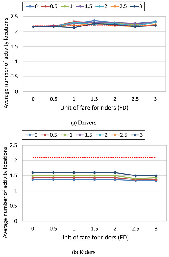 To compare matching efficiency, Figure 9a,b illustrates the average number of activity locations for drivers and riders, respectively. (Note that the maximum number of activity locations for both drivers and riders is assumed to be three.) The average number of activity locations for drivers remains unaffected by either or but is generally higher than the average number of activity locations obtained in our previous model (Shimamoto [6]), as indicated by the red dotted line. Conversely, for riders, the average number of activity locations is lower than in our previous model (Shimamoto [6]), also represented by the red dotted line. Furthermore, the average number of activity locations for riders remains constant at up to 2.0 with respect to but decreases as increases. In contrast, the average number of activity locations for riders tends to increase as rises. These findings suggest that the Nash equilibrium solution does not necessitate drivers to take unnecessary detours compared to the system-optimal solution, thereby increasing the driver’s opportunities for activity while reducing those of the rider. However, the decline in the rider’s opportunities for activity can be mitigated if the fare received by the driver is higher.