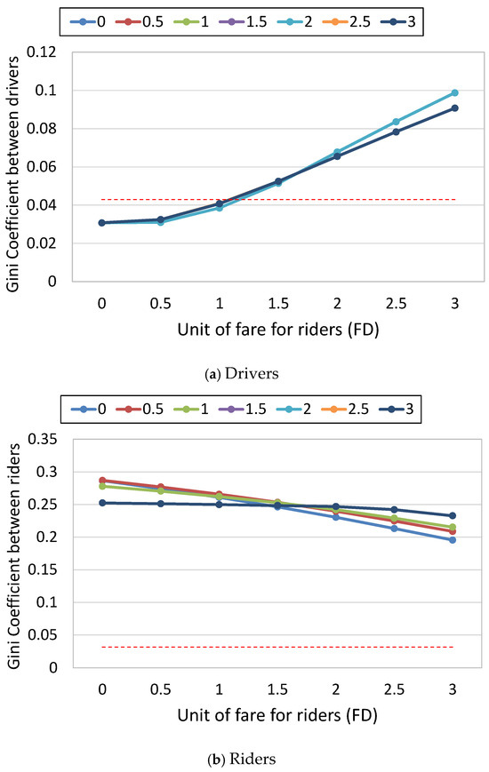 Finally, Figure 10a,b illustrates the Gini coefficient of utilities among drivers and riders, respectively. Note that the Gini coefficient is the economic indicator most often used to measure income inequity (Shimamoto [6]). The coefficient assumes a value between 0 and 1, where 0 corresponds to perfect equity and 1 to perfect inequity, and is calculated as follows: