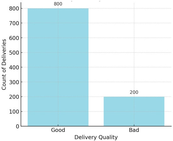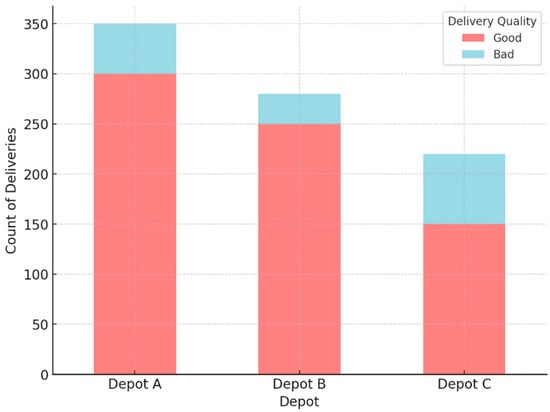 Figure 6 presents the distribution of “Good” and “Bad” delivery outcomes by depot. Depots with higher instances of “Bad” deliveries can be identified for targeted operational improvements, such as training staff or optimizing handling procedures. By focusing on depot-specific quality issues, logistics managers can address localized inefficiencies, supporting Objective 1. This figure highlights the importance of analyzing quality by location to improve consistency across the logistics network.