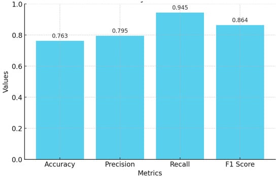 This bar chart below (Figure 7) visualizes the model’s performance metrics, including its accuracy, precision, recall, and F1 score. The model achieves an accuracy of 76.3%, a reasonable level for logistics applications. The recall score of 94.5% is particularly high, indicating that the model is effective in identifying “Good” deliveries, though a precision score of 79.5% suggests that it may over-predict these outcomes.