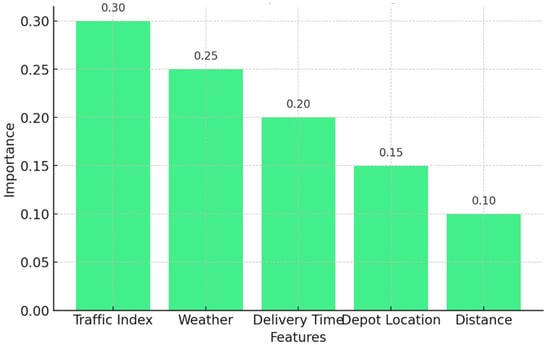 Figure 9 shows the relative importance of each feature within the predictive model. Factors such as traffic congestion and weather conditions are the most influential, followed by delivery time and depot location. Understanding which features impact delivery predictions the most enables logistics managers to focus on the most relevant variables. This analysis is crucial for Objective 1, as it highlights key areas (e.g., traffic, weather) for targeted monitoring and data collection.