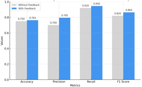 Figure 11 compares the model’s performance with and without the adaptive feedback loop across metrics such as the accuracy, precision, recall, and F1 score. With the feedback loop, improvements are seen across all metrics, illustrating the benefits of feedback-driven adjustments. The significant performance gains when the feedback loop is active demonstrate the adaptive value of real-time updates, aligning with Cybernetic Theory. This supports Objective 3 by showing that the feedback loop improves the model’s reliability and responsiveness to changing conditions.