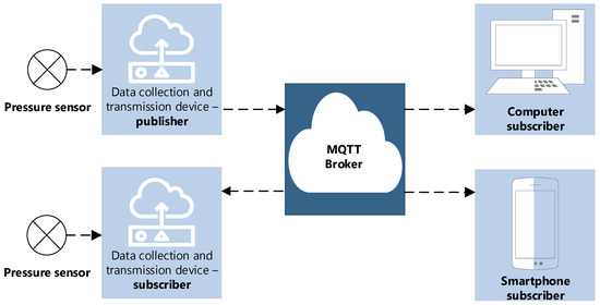 An information system has been developed for the operational monitoring and archiving of the pressure parameters of pumping stations in the water supply system of Gomel (Republic of Belarus). Within the framework of this system, adhering to the concept of the Internet of Things (IoT), a network of interconnected smart devices was deployed that automatically collect, exchange, and process data [26]. Figure 1 shows the diagram used, demonstrating the connection of pressure sensors to data collection and transmission devices that polled these sensors and sent the received information in raw form to the computing server [27]. To ensure the reliability of receiving and transmitting information, a specialized Mosquitto broker (MQTT broker) was installed on the server, acting as a central node. It ensured the coordination of data transmission between data publishers (pressure sensors) and subscribers [28] (personal computers, telephones). The developed architecture facilitated a prompt response to changes in system parameters and the formation of statistical data for the subsequent training of the long short-term memory model.