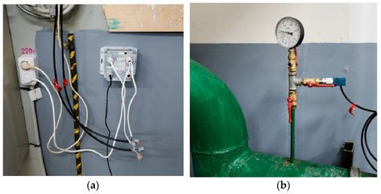 The process of connecting the pressure transducer at the pumping station to the data collection and transmission device. (a) External view of the data acquisition device; (b) Example of connecting a pressure sensor via an existing manometer adapter without tapping into the pipe.