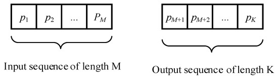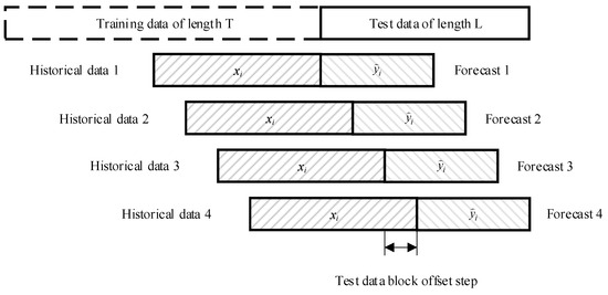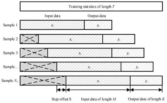 2. Dataset generation: In the forecasting process, a sliding window method with a given step was used to obtain new test data [32]. For each time step t (starting from the first element of the test sample to the end of the time series L), a data block of length M (data history) was used as input and the next K elements were used as the target variable. This formed a dataset of size (T − M − K + 1) × (M + K), where each row contains one set of input and output data (Figure 5).