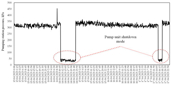 4. Model quality assessment: The obtained predictions were compared with real observations. A distinctive feature was the assessment of both the average error at each step of the block displacement t over the entire depth of the forecast K, and the calculation of the average error of all predictions. In the studies conducted, classical metrics were used to assess the quality of the pressure forecasting model: MAPE (mean absolute percentage error), MAE (mean absolute deviation), and RMSE (root mean square error). Despite the widespread use of MAPE, this metric does not effectively cope with zero values, which is typical for scenarios related to an emergency pressure drop or the on/off modes of pumping stations (Figure 6). In such cases, MAPE gave a distorted estimate due to the mathematical uncertainty that occurs when dividing by zero.